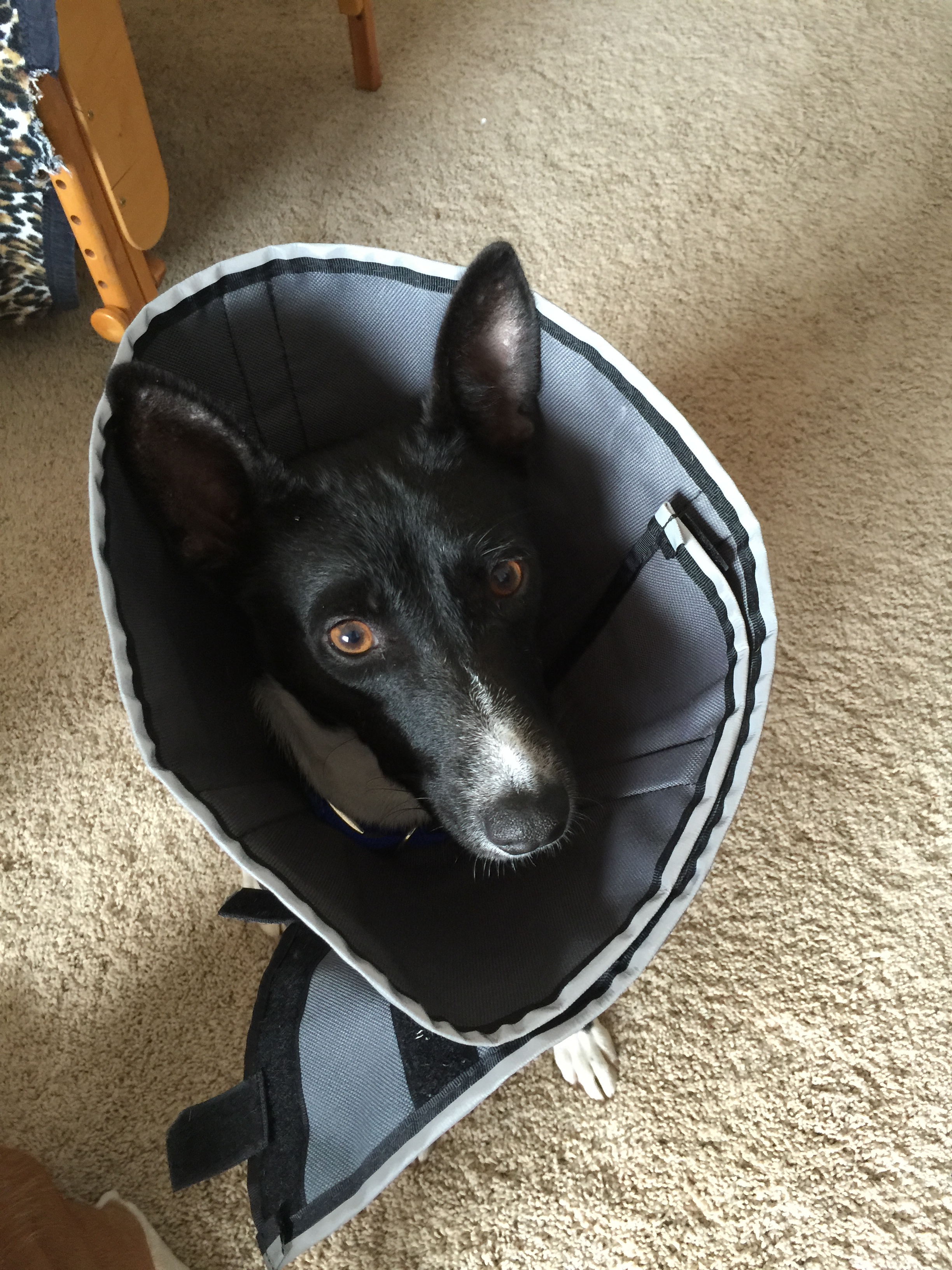 Romeo has a spot that has been bothering him on his tail for a few weeks. We’ve had him on Prednisone (they think it is an allergic reaction gone ballistic) and an antibiotic to fight the resultant skin infection, likely a result of incessant licking and exposure to abrasive sand. I love Romey dearly, I really didn’t want to put a cone of shame on this sweet little guy.